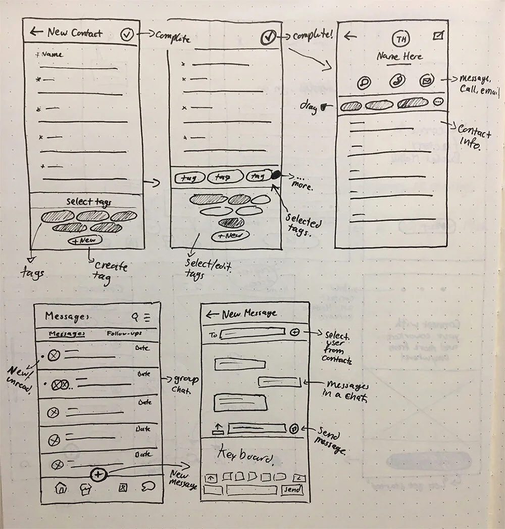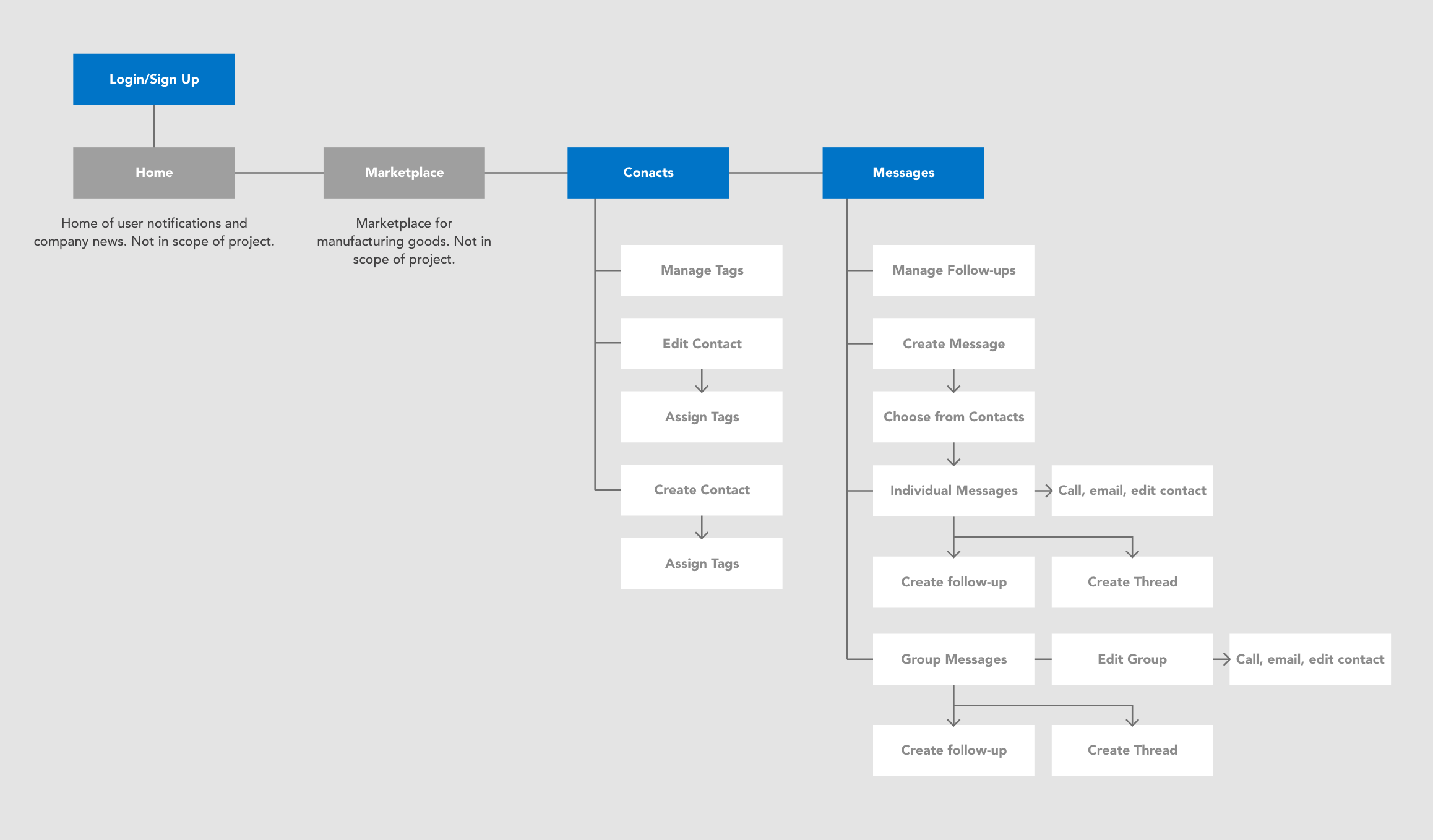 After a group card sorting activity, I created a site map to visualize what ideas belong where. One of those ideas was a tag system that would allow users to organize their contacts into groups. An example of a group might be users colleagues, different departments within an organization, suppliers, etc. This feature is echoed throughout the messenger feature, allowing users to filter by various tags when selecting a contact to message.
