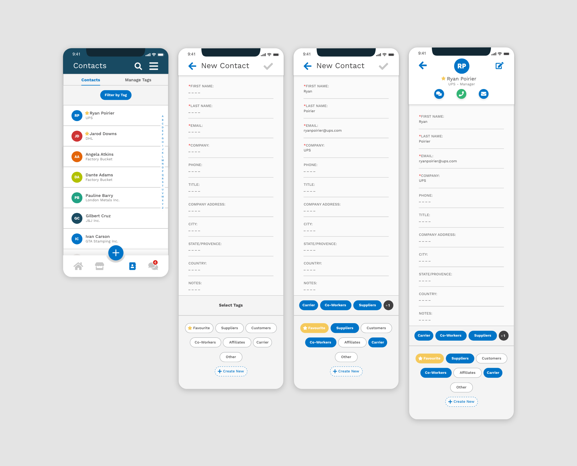 First, our persona Jackie will click the blue plus button to create a new contact. Second, she enters all required fields in the contact card and selects and/or creates tags to categorize her new contact. This will help when searching for this contact in the future and allow Jackie to filter based on the tags she has created. Once Jackie has satisfied the required fields, the checkmark in the top right corner can be clicked to save this contact.