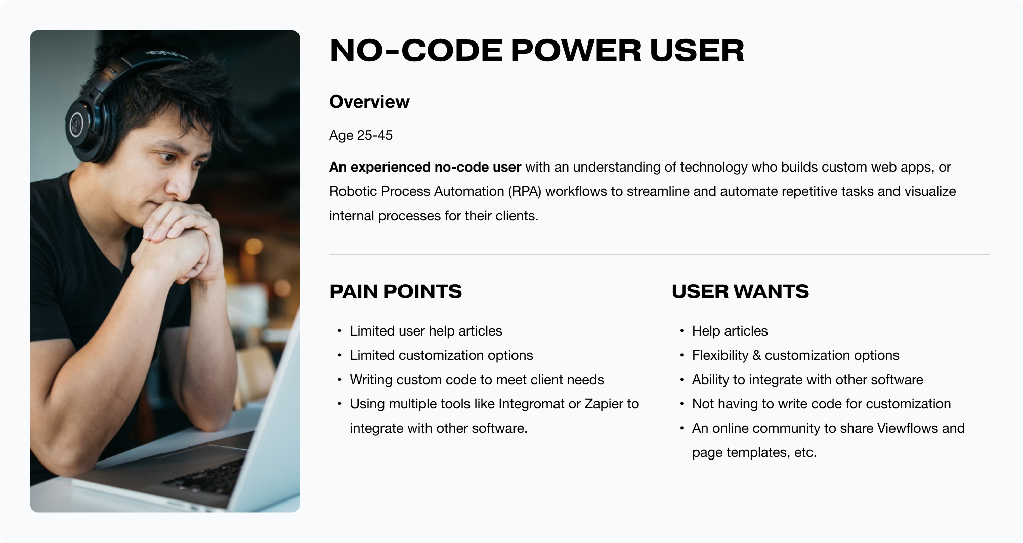 I also uncovered key pain points with no-code competitors, including limited customization, minimal support resources, and the need to stitch together multiple tools like Knack & Integromat, or Zapier to make workflows work.