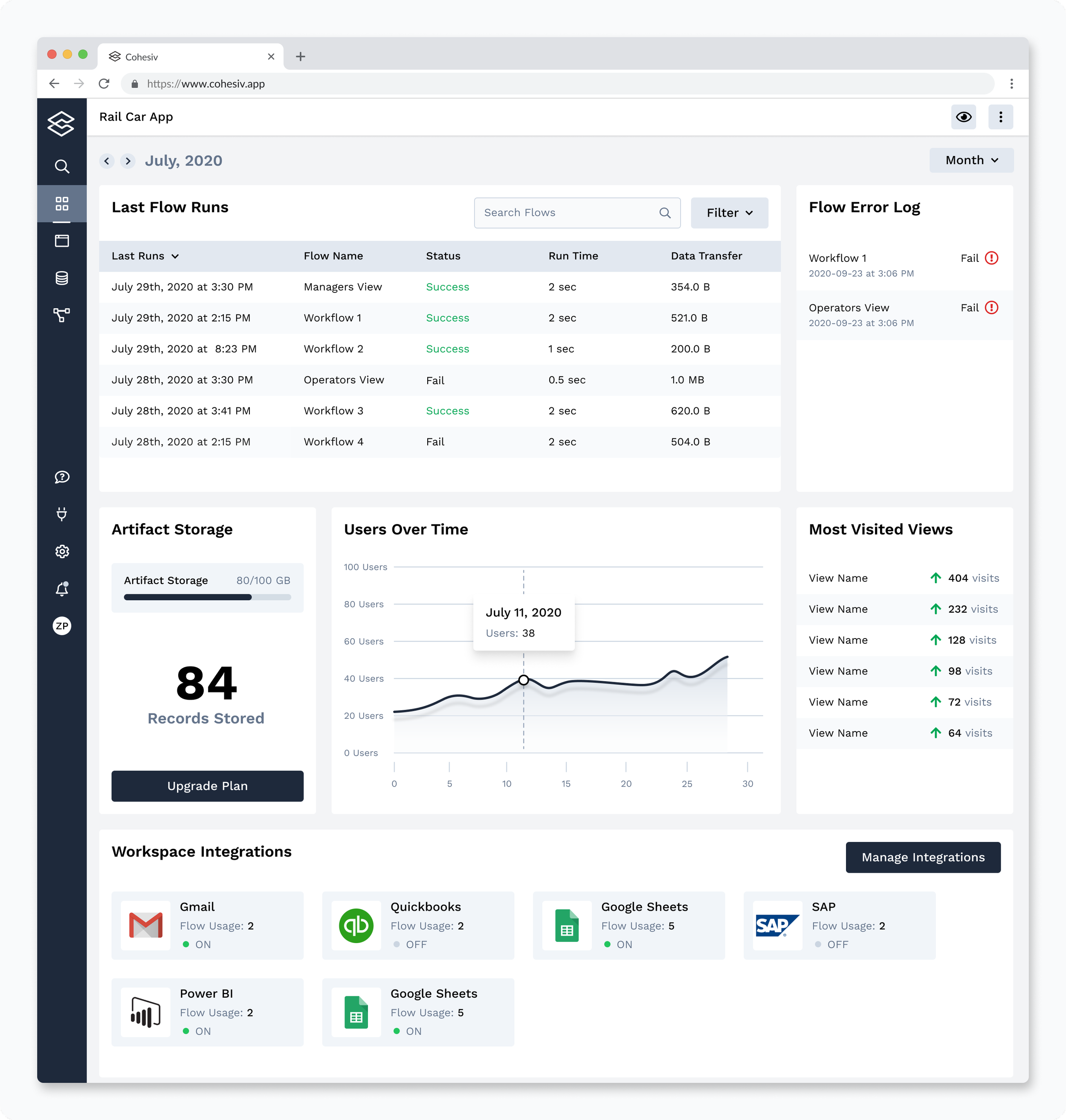 Each workspace can be customized with a title, icon, and description. Users can also access their Workflow dashboard with key information such as error logs for debugging, third-party integrations, user insights, and most-visited pages.